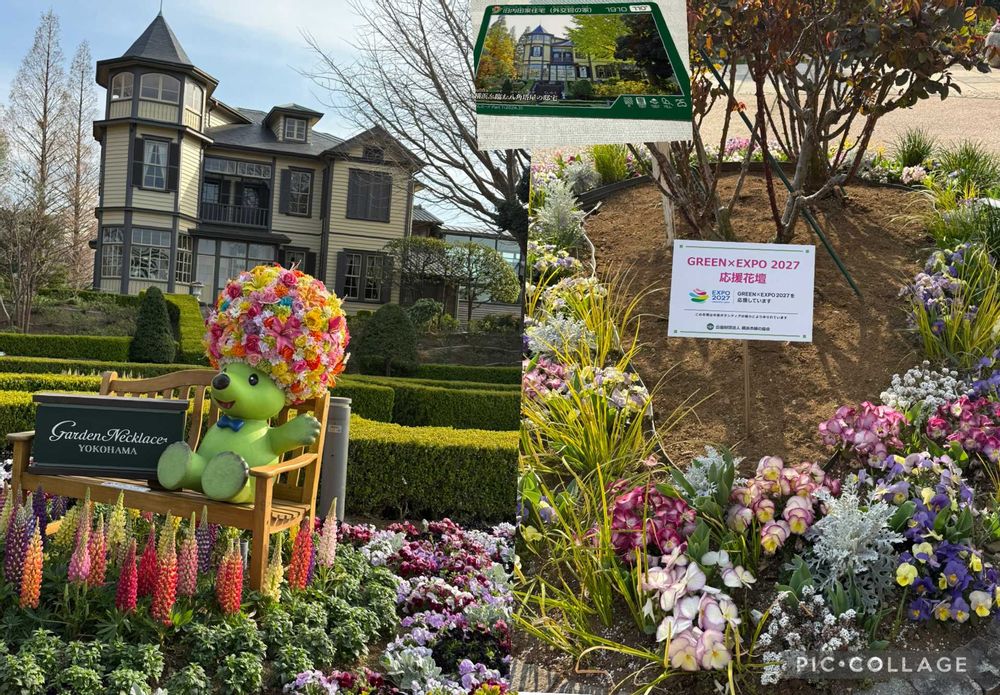 昨日れきけんカードをもらいに山手外交官の家に行くとグリーンエキスポ応援のきれいな花壇やガーデンベアがいました。