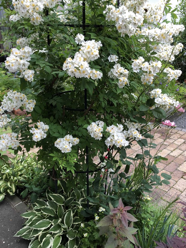 オベリスクの一季咲きロサ ムルティフローラがあまり咲かずシュートだけが凄いので処分する事に…(元はプリンセスドゥモナコの根元から生えてきた台木)