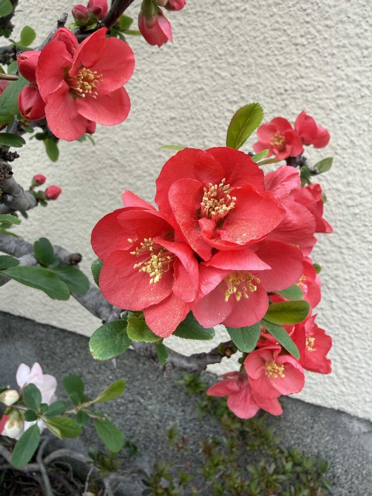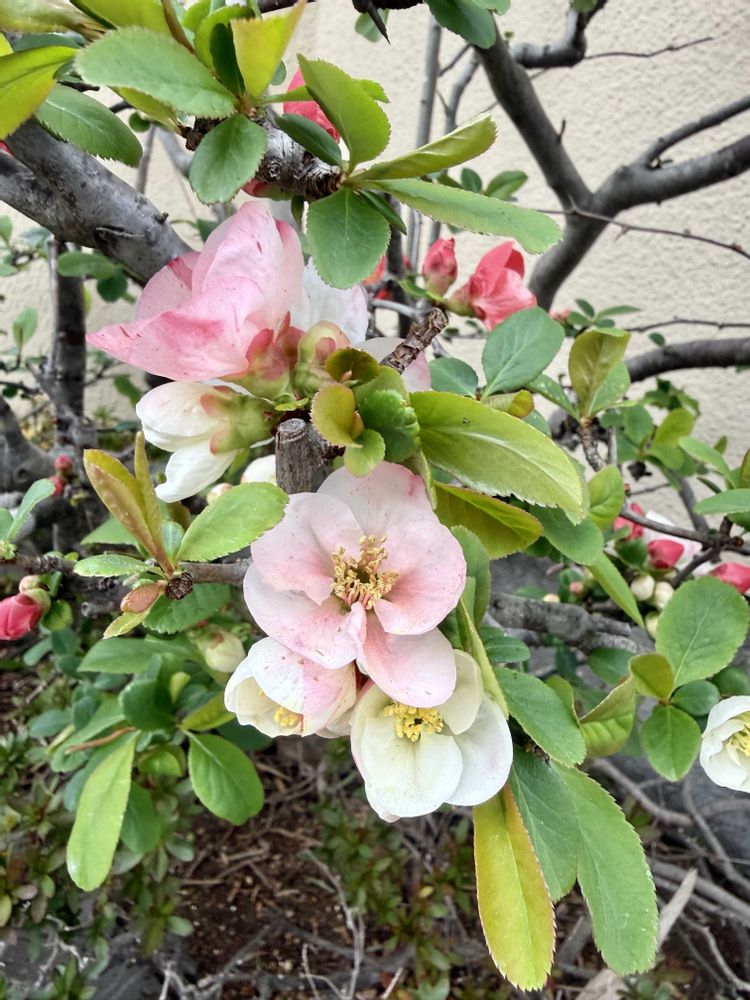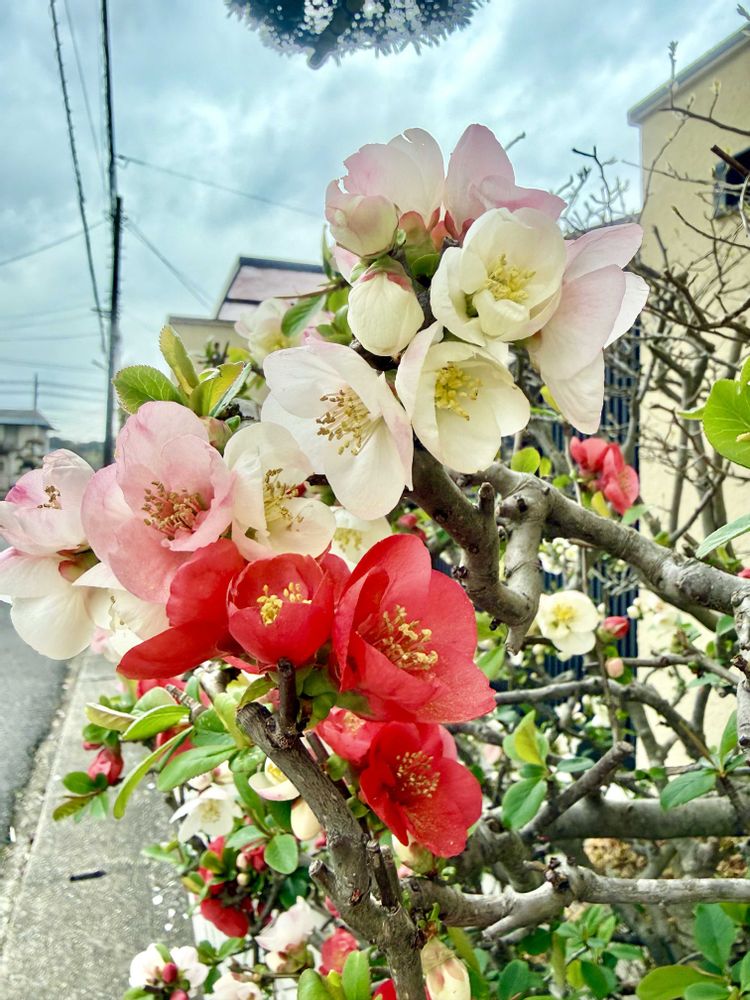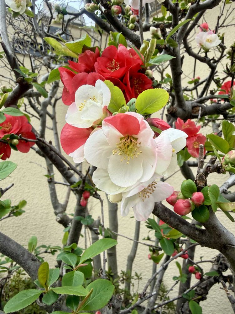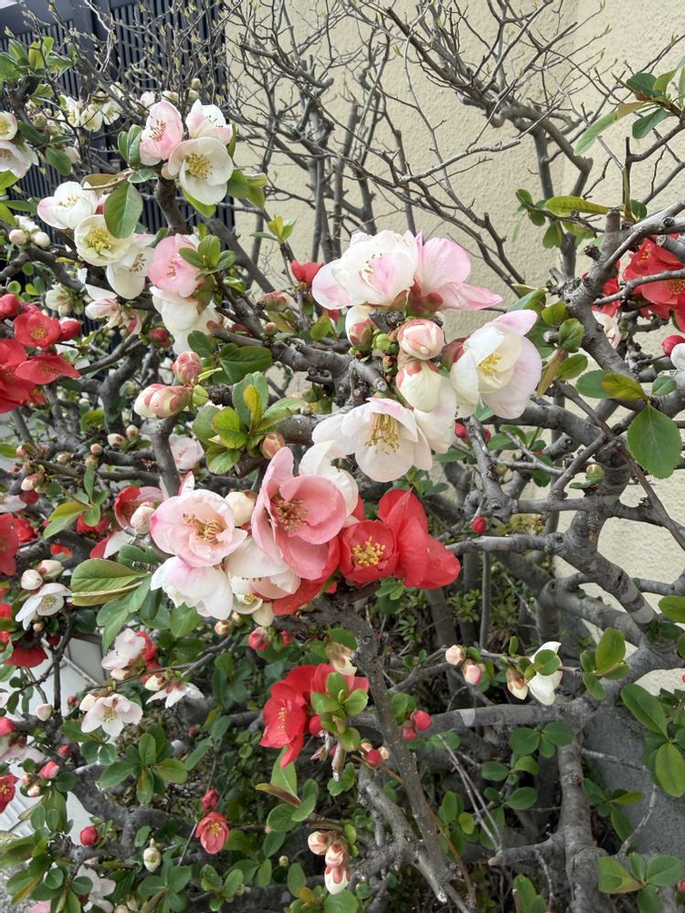 ご近所の紅白のボケが、綺麗に咲いてました。1つのお花で紅白の花びらとか、ピンクのお花も!😍