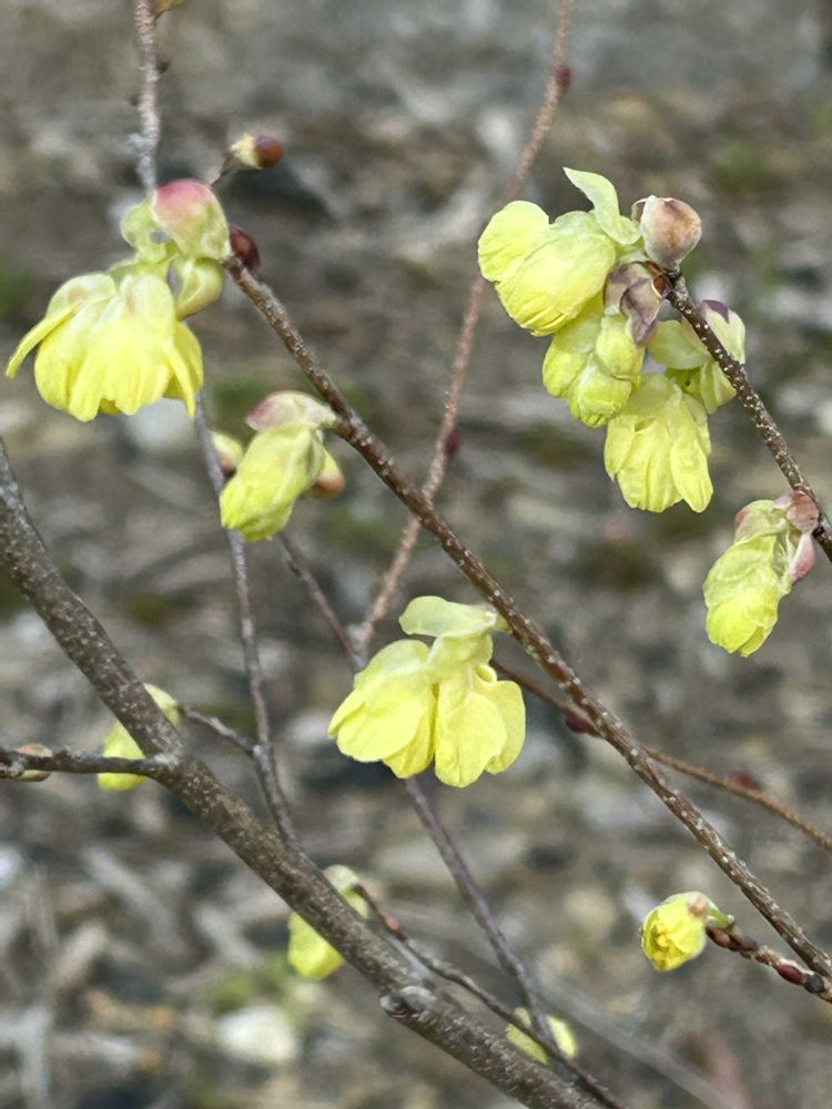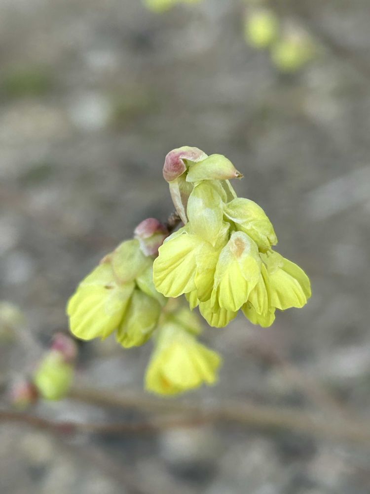 花は葉が出るよりも早く、3月下旬に2.3個の丸みのある黄白色の小花が花序になって数多く下垂する