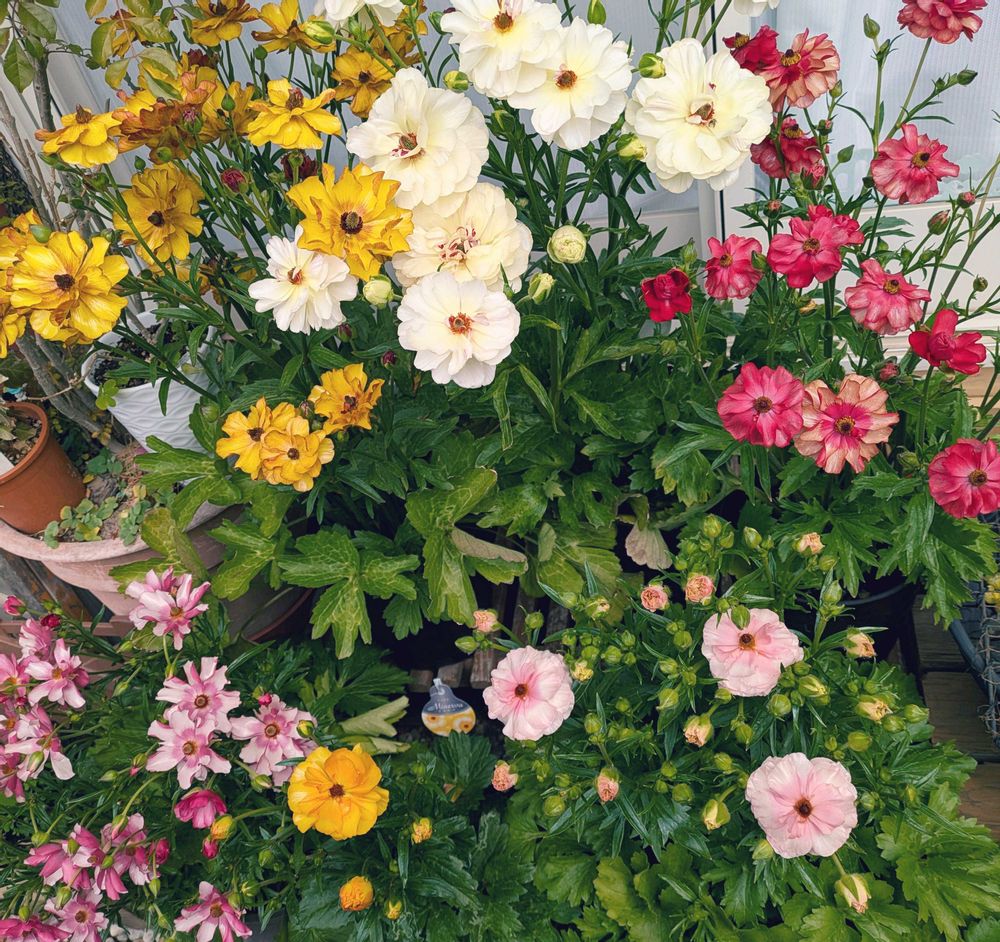 ひと足先に咲いたラナンキュラスラックス次々咲いて見ごろになっています💛❤🤍🩷💛