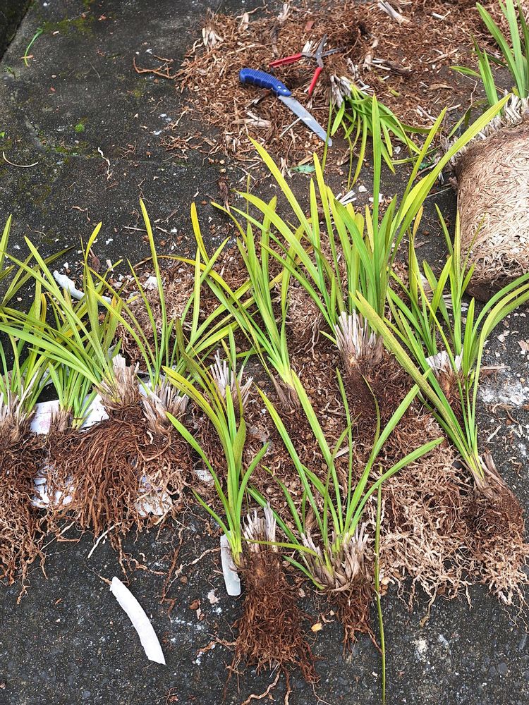 ノコギリと剪定鋏で分けて各々鉢に植え替え。掃除して片付けまでで15時に完了。