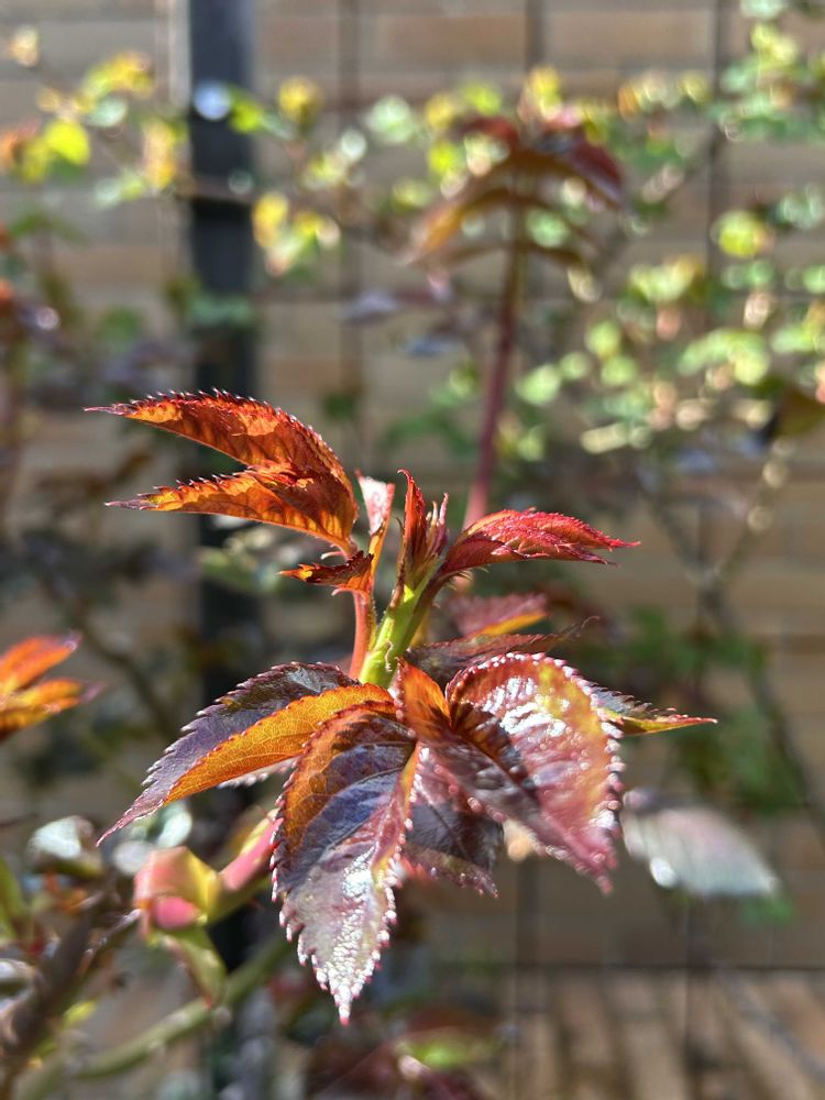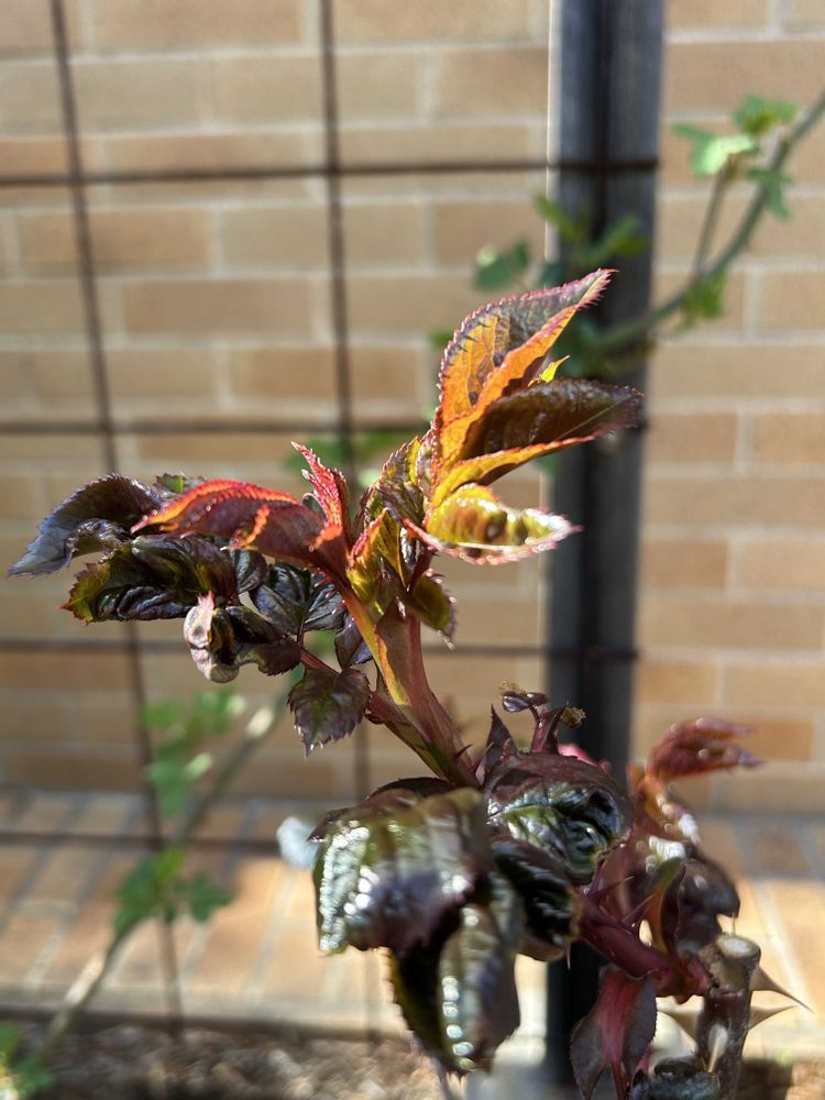 ①バラのツヤツヤ新葉が展開しています…が!