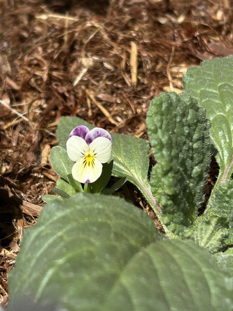 こぼれ種から育ってるボリジの葉っぱから、これまたこぼれ種っぽいビオラが覗いてる👀‼️…と言っても去年この様なビオラはここに居なかったけど??