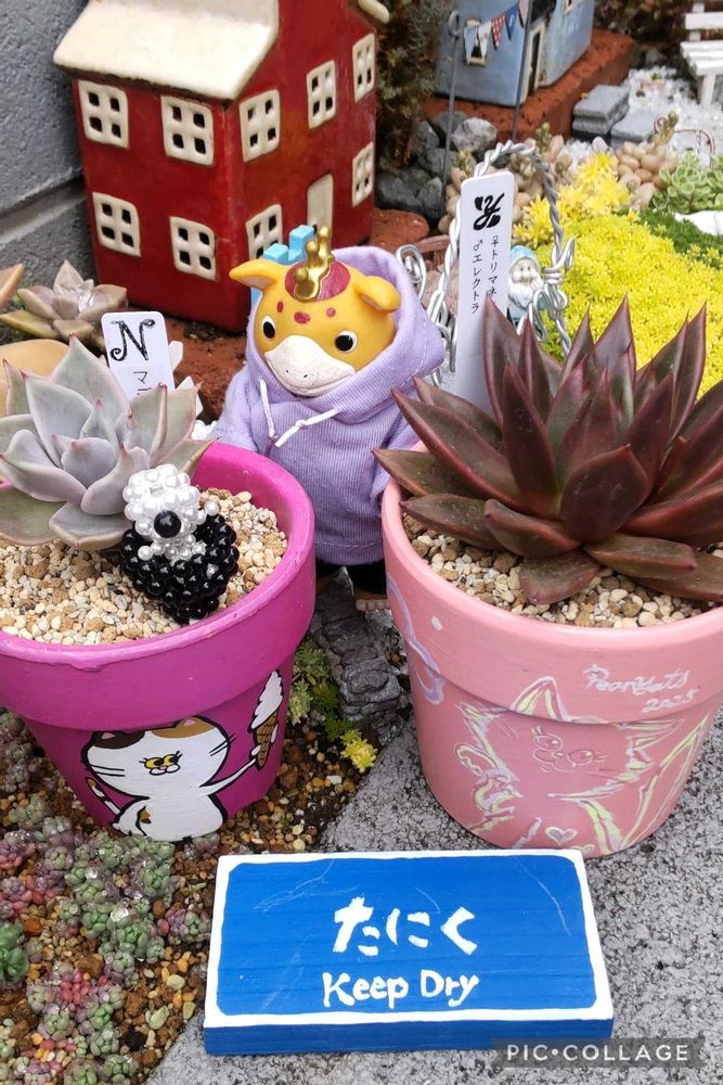 1枚目は、お気に入りのpeanyatsの、リメ鉢に入った苗たち。昨日届いた45さんのビーズの目玉オヤジ可愛い💕