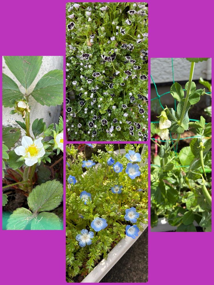 おはようございます。晴れ、14.6℃、10:20ちょうどいい、昨日の花粉量24個少ない。久しぶりに良い天気です。イチゴ2540日目今年も花が咲き出しました。ネモフィラ、ペニーブラック&インシングニスブルーたくさん咲きました。つるありスナップ花&実もでき始めました。今日の収穫はチマサンチュ&レタスです。😻🥰😍☺️😸😋