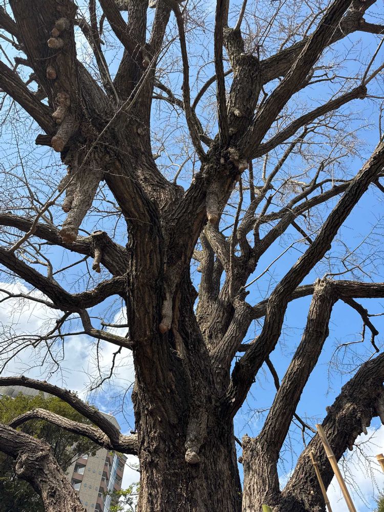 イチョウは老木になると幹枝から「乳」あるいは「垂乳」と呼ばれる乳房状のこぶが垂れ下がることがあり、このイチョウにも見られます。