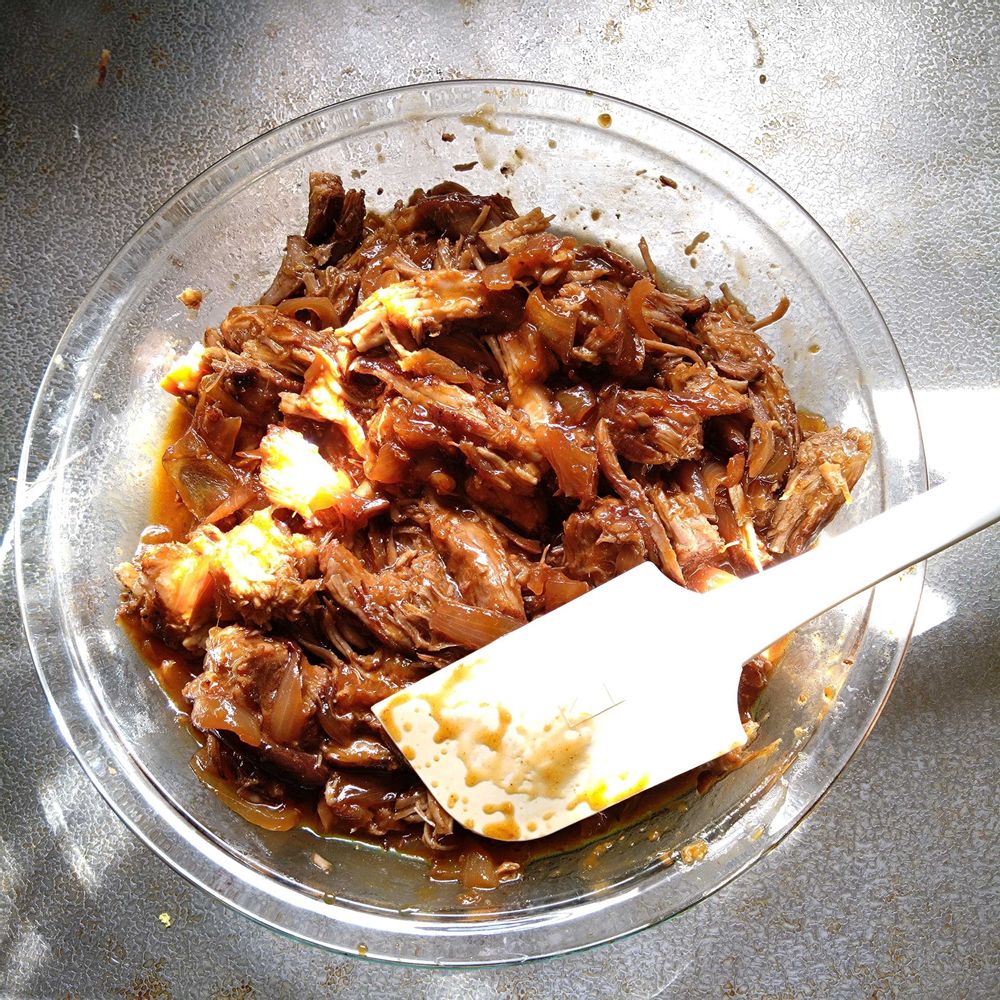 ③鍋のソースは煮詰めて水気を飛ばし、ほぐした肉と和えました🐽