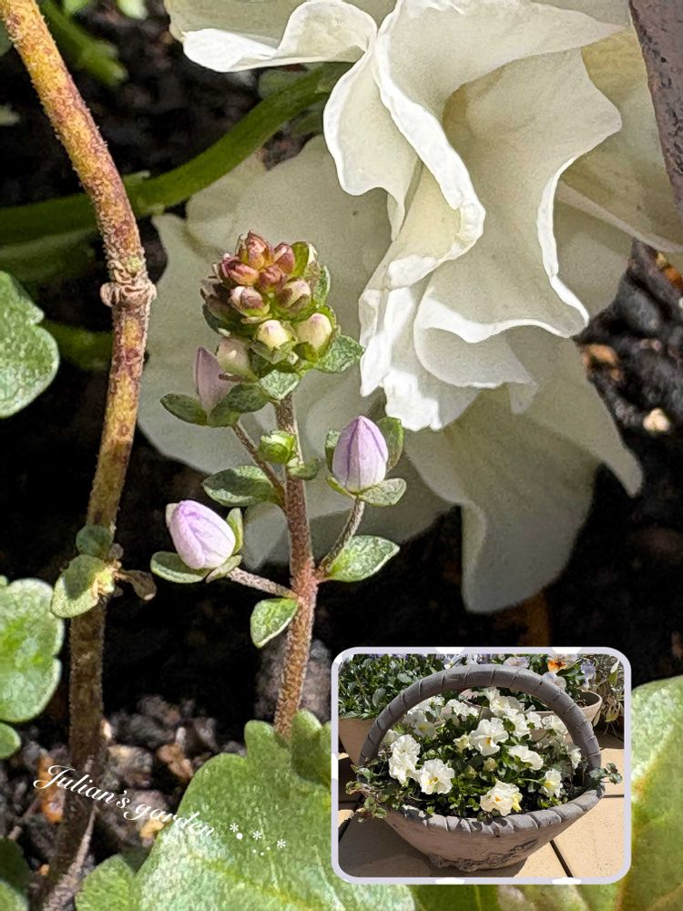 ①陶器の籠に入れた白いフリフリビオラの手前に4年目のベロニカ ウォーターペリーブルーを入れてやっと花芽がつき蕾が膨らんで来ました💜