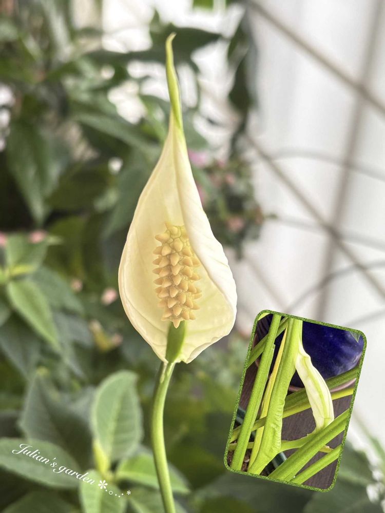 ⑤株分けしたスパティフィラムの蕾が開いてきたと思ったら↘️もうひとつの花芽がついてきました🤍💚