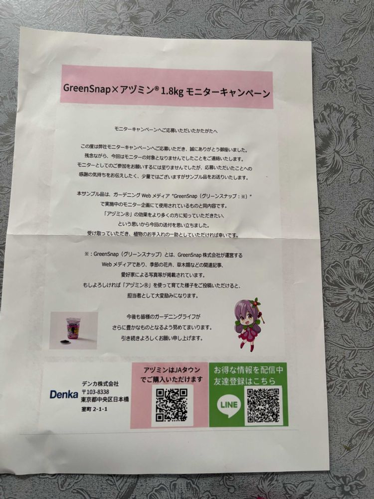 アヅミンモニターキャンペーンに応募したんですが、モニター対象になりませんでしたという内容のお手紙には、感謝の気持ちにサンプルを送りますということでした。