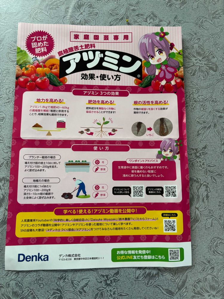 使い方は、プランター、植え付け前の培土10ℓに対してアヅミン100~200gを加え、よく混ぜ込む。