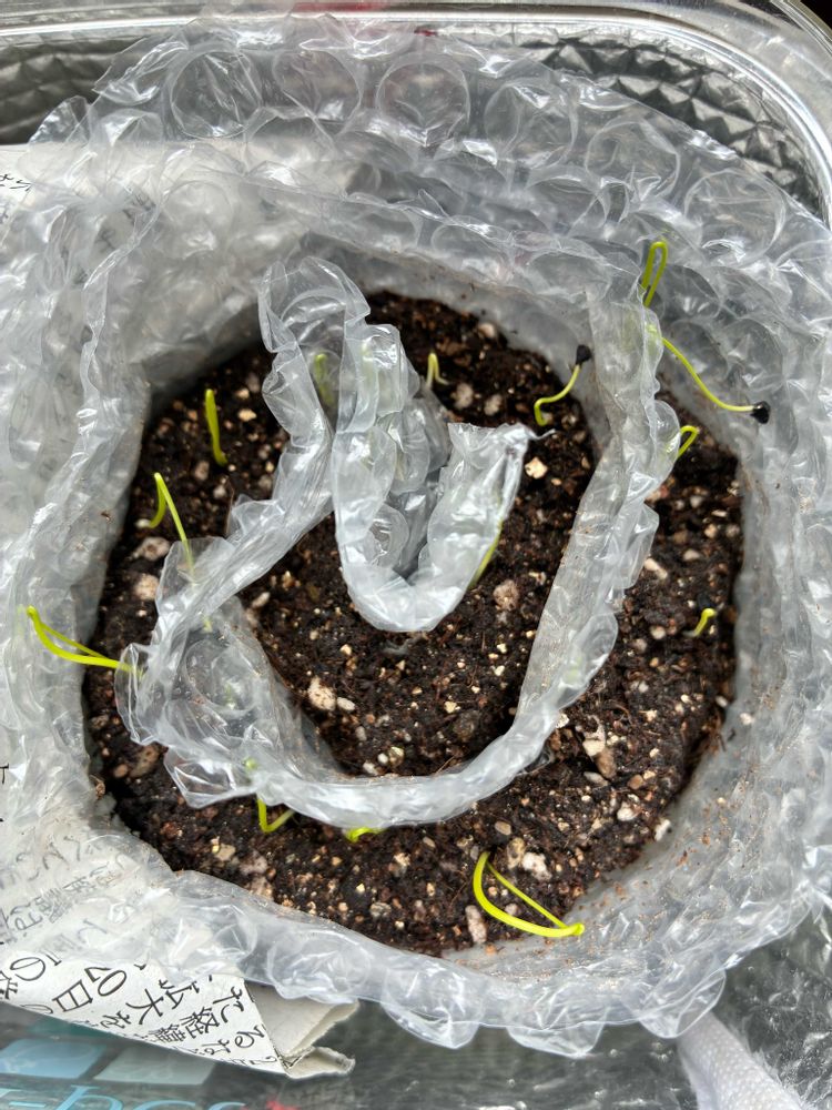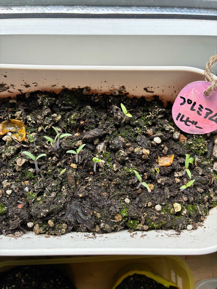 去年の苗を冬季間ウチの中で水耕栽培してたけど、途中管理出来ず、果実は中途半端で苗は終わってしまいました。その果実から種を鉢にぶち撒けて(洗ったり、乾燥させたりせず、そのまま)…発芽したので記念に📸