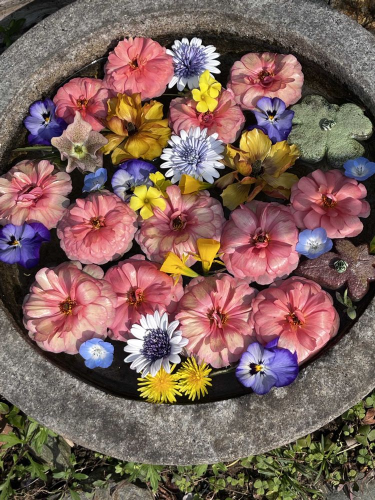 石臼に雨水が溜まっていたので花を散らしてみました💕💖