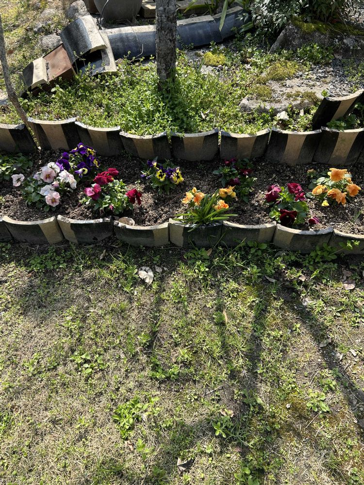 我が家の花壇に色とりどりのパンジーが咲いています