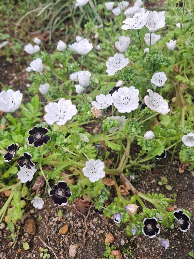 ネモフィラベニーブラック🖤零れ種からのネモフィラ🤍🖤