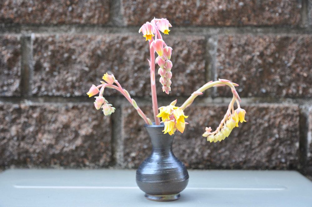 カットした多肉植物の花芽を一輪挿しにしました(一輪じゃないけど)。しばらく、部屋の雰囲気アップになります。