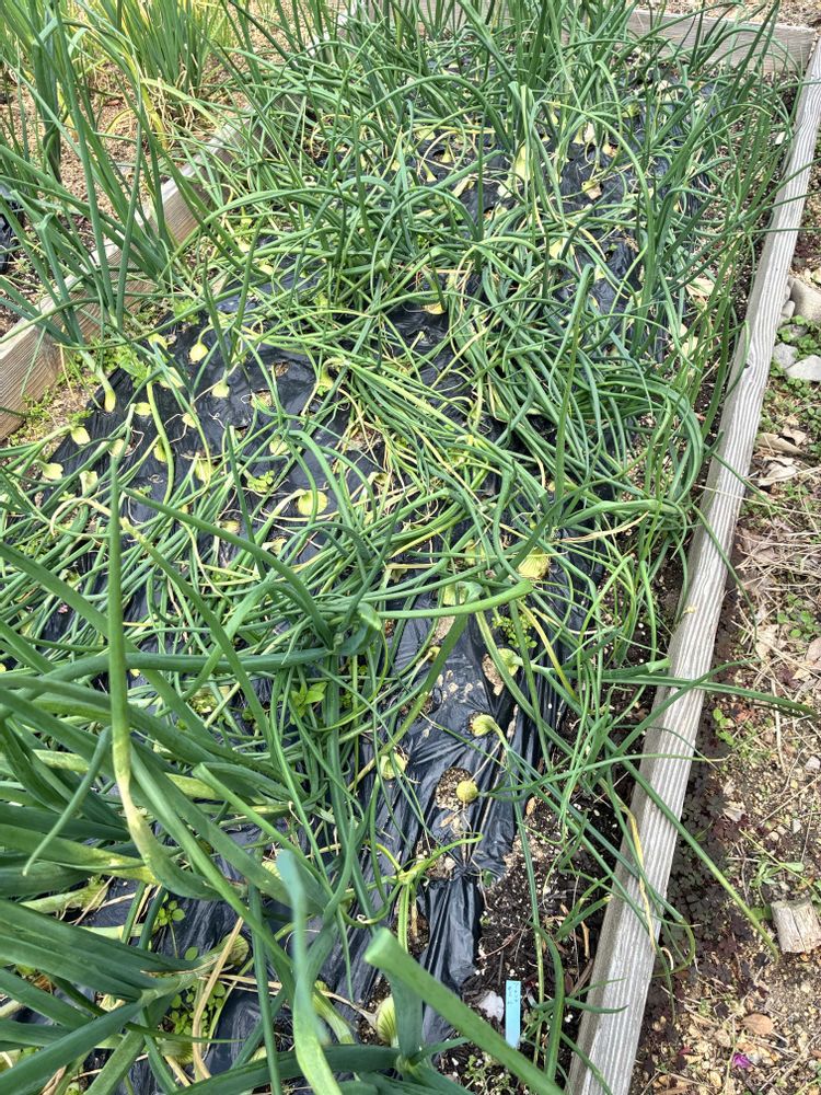 ④超極早生の玉ねぎが倒れてるんだと思う😂ちゃんと追肥してたら大きくなってから倒れたんだろうな。
