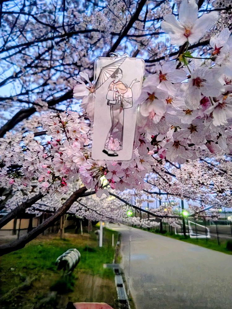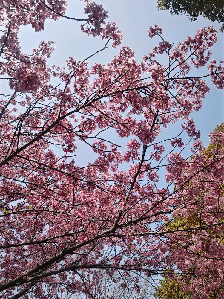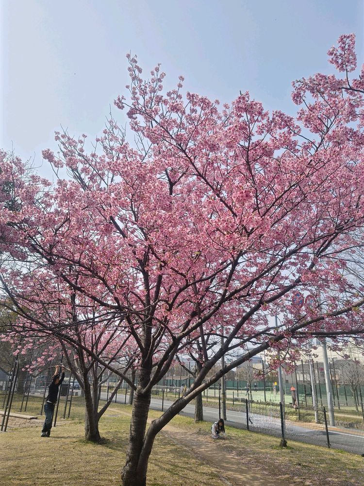ご近所の桜🌸巡り。1枚め~3枚め、仕事帰りまわり道した公園の陽光桜。濃いピンクが目を引きます。