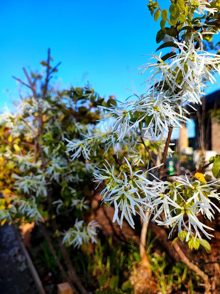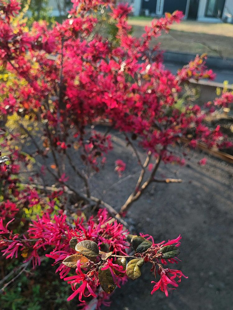 トキワマンサクがキレイに咲いてます。ちょっとレアな黒葉赤花の黒美人と、青葉白花です。よくある赤葉紅花さん達(値下げ苗を買った子達)はまだ咲いてません。