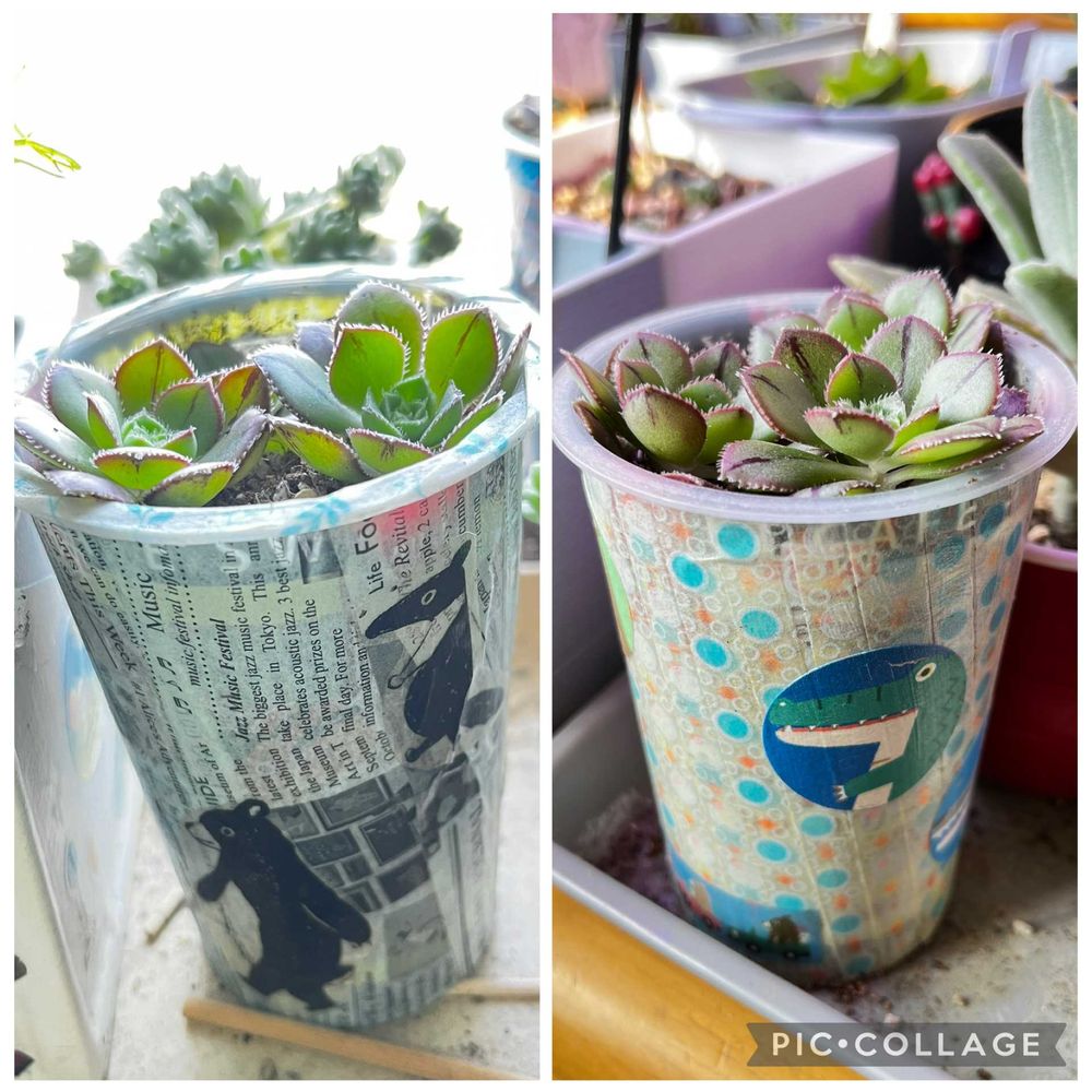 ゼリーのカップにマステ🤣(マスキングテープ)とシールでデコパージュしたもの。