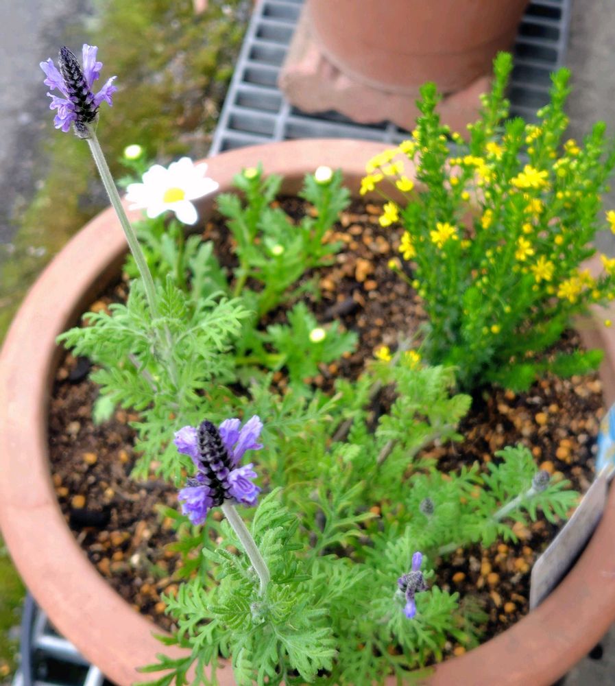 ①ラベンダー🪻、ゴールデンクラッカー、ノースポールの寄せ植え、可愛い取り合わせ💕。