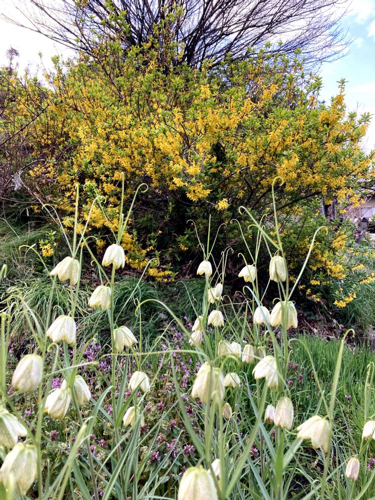 初めての名前バイモ🌱眼が不調な私🧓には 見た瞬間に スノーフレークかと 思いました(o^^o)🔔直向きで 淑やか〜可憐な花 背後の黄色💛と相まって春ですねー❣️🤗
