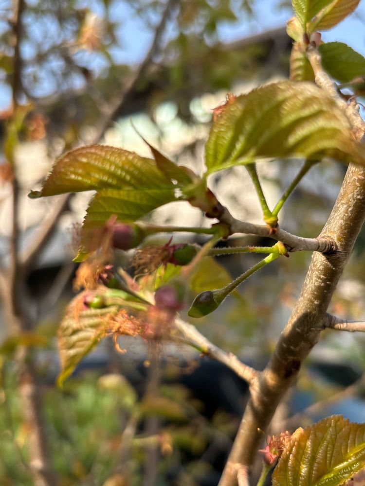 こちらに来た先週水曜日の夜にはまだ花がたくさんあったさくらんぼの木もたくさん葉っぱが芽吹いてきました。よく見るとさくらんぼ🍒予備軍。楽しみ、今年は花が100個はあったからね。