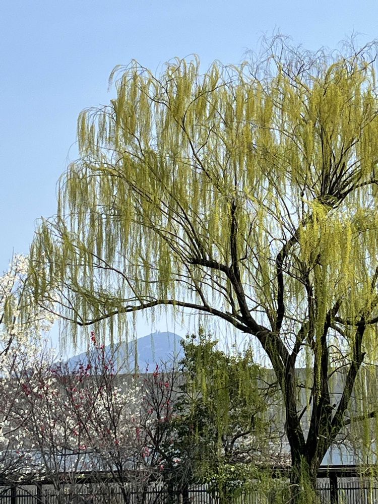 私は大芝生広場の手前のシダレエンジュの木を透かして見る比叡山がお気に入りです😄