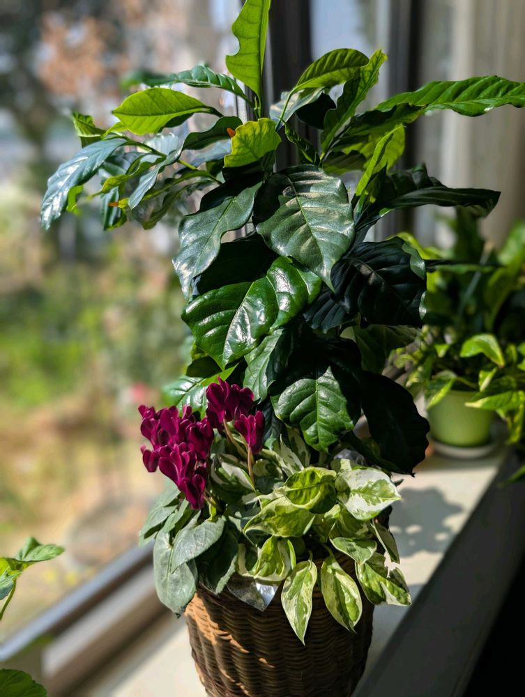 寄せ植えは古くなった籠にビニールを引いて植えてみましたけどシクラメンが1月からずっと咲いてコーヒーの木もだいぶ大きくなりました😄