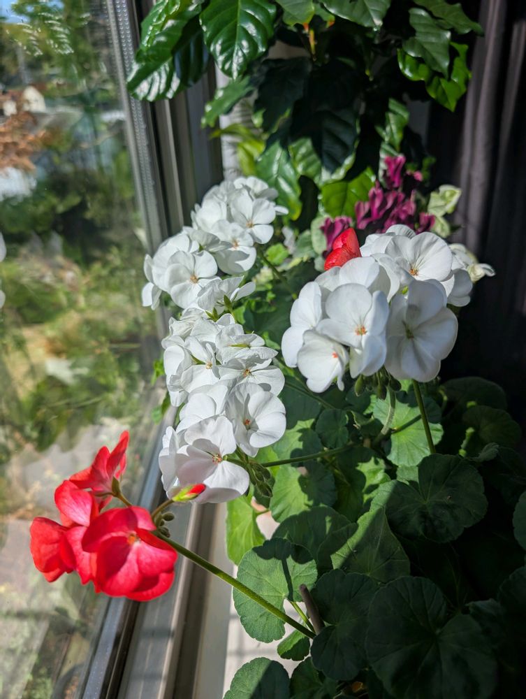 今日のお花は出窓組のコーヒーの木とゼラニウムです