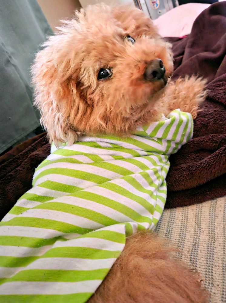 こっち向いて〜‼️🐶 今日は春の緑色 💚✌