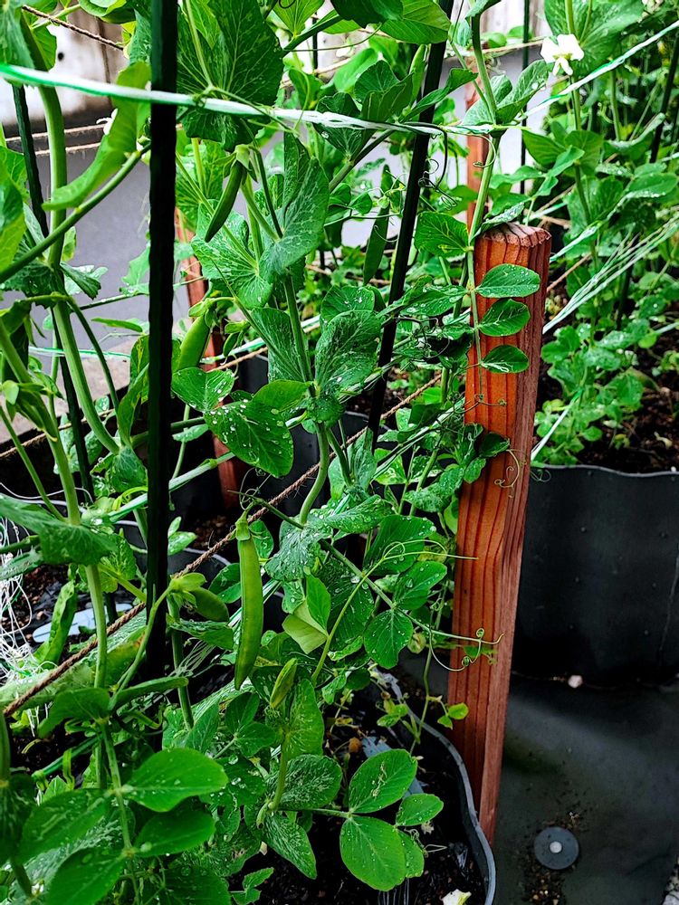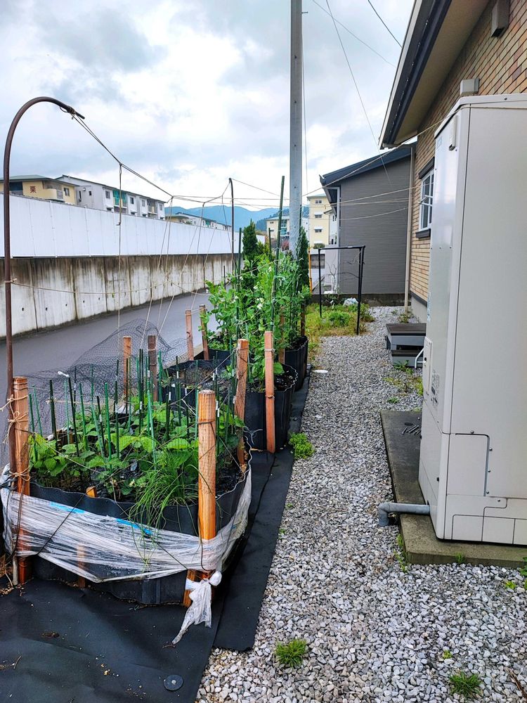 なんちゃって畑のスナップエンドウを確認&誘引して、追加のポールを立てて麻紐を張ってきました。これでツル用ネットとか遮光ネットとか張りやすくなりました。北側ですが暑くなるので遮光ネットは必須です…