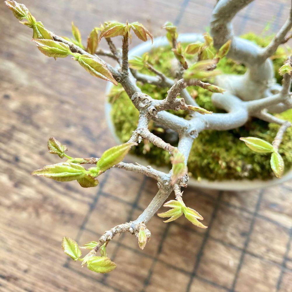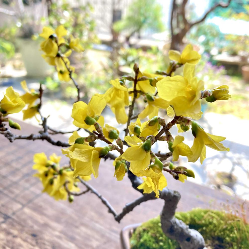レンギョウ(樹高15cm)が満開です。トウカエデ(樹高10cm)の芽も出てきました。