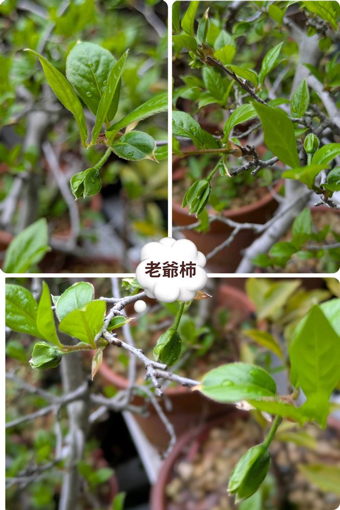 ①いつからあったのかもわからない老爺柿は昨年よりも沢山の花芽が付いていますが、雌雄揃っていなくてこれ1本しかないので