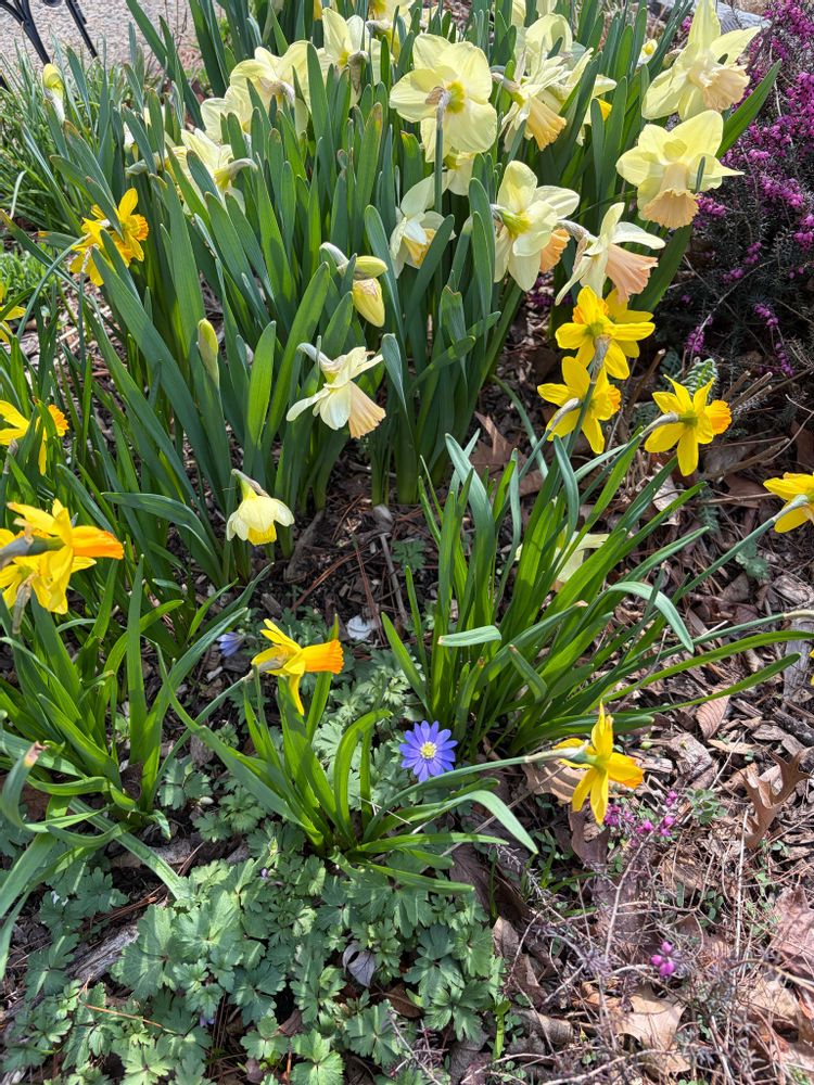 ① 水仙の間に紫の小さなアネモネブレンダが咲き出しました。 小さくて可愛い🩷