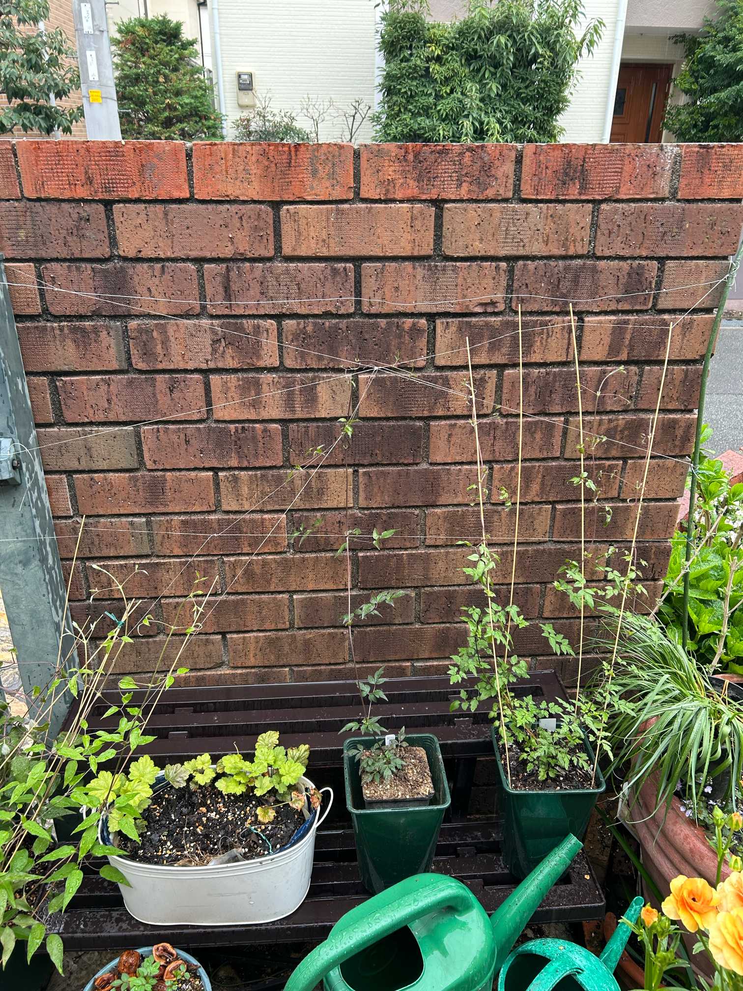 クレマチスの誘引をテグスでレンガ塀に這わしてみる挑戦です。フェンスはお高いし増やしたくないしで考えついたのがテグス誘引です😊 白いフェンスのみに使用してましたが西陽が強くレンガ塀にテグスを這わせてみる事に身してみました😊 備忘録ですがご参考になれれば嬉しいです☺️