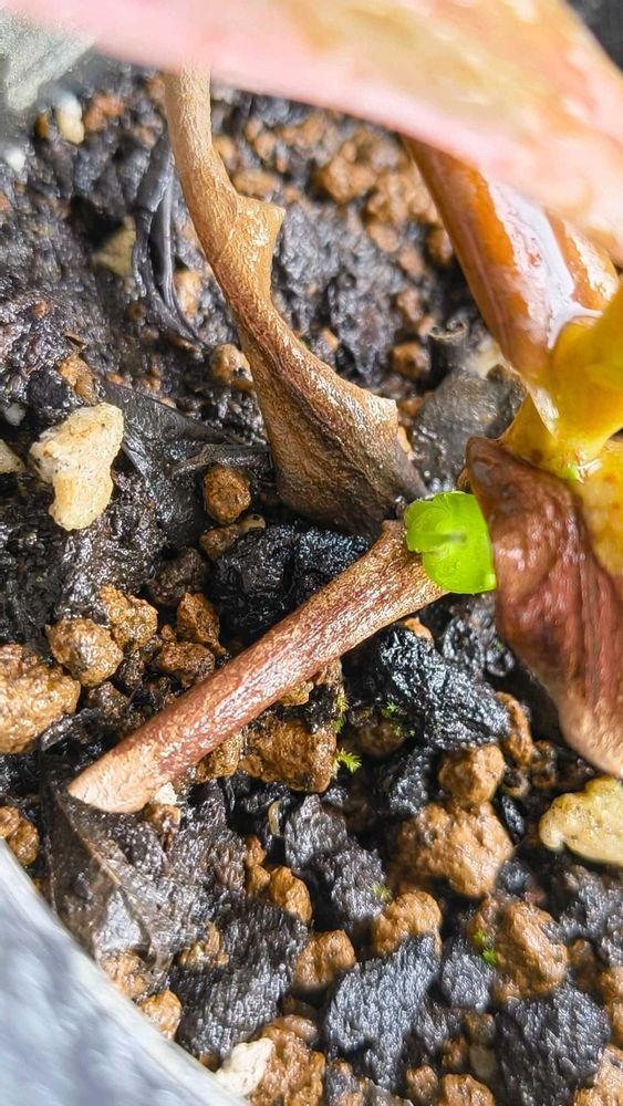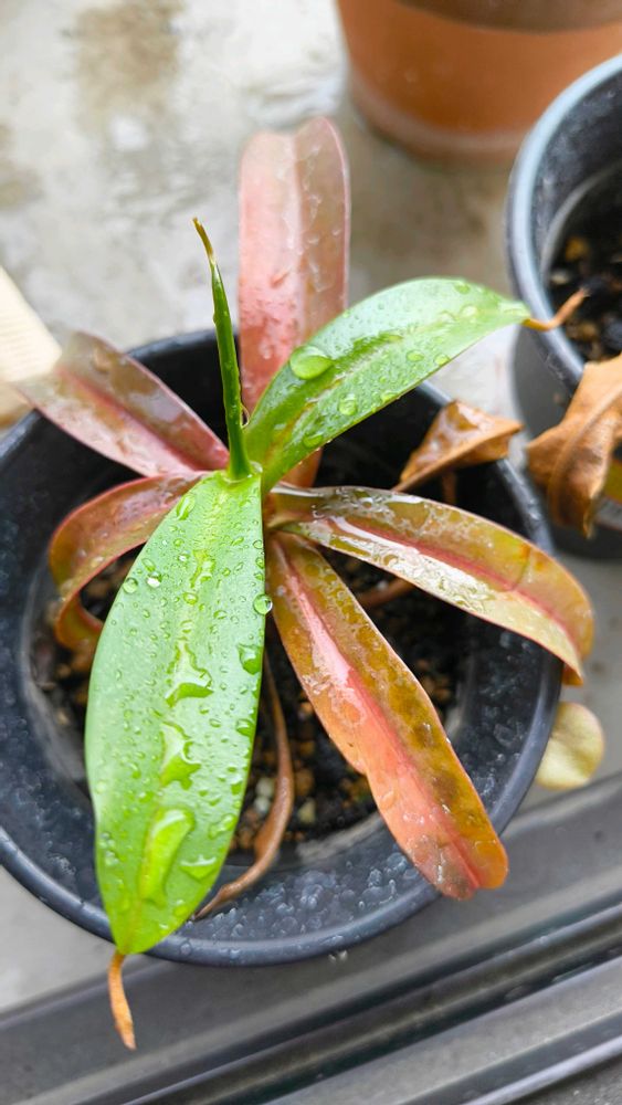 真冬のホームセンター屋外で死にかけてたウツボカズラレベッカソパー、2鉢救出してひとつは無事新葉が展開。もうひとつは成長点が腐りダメ元で切ったら脇芽🌱が!