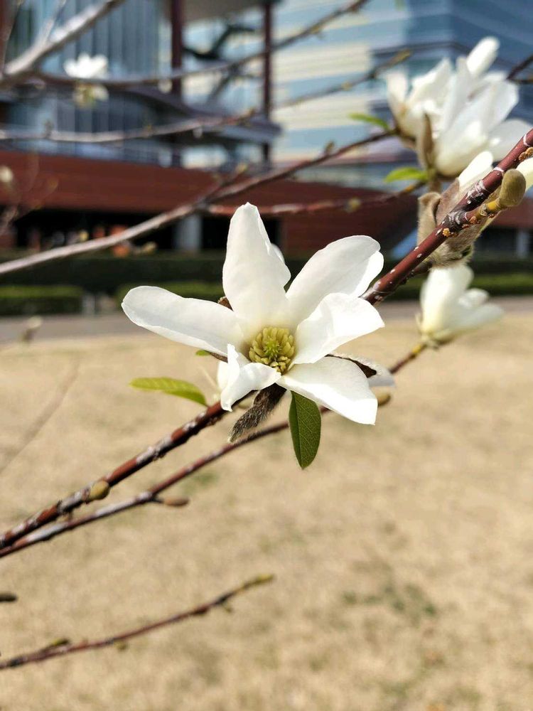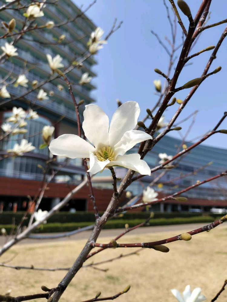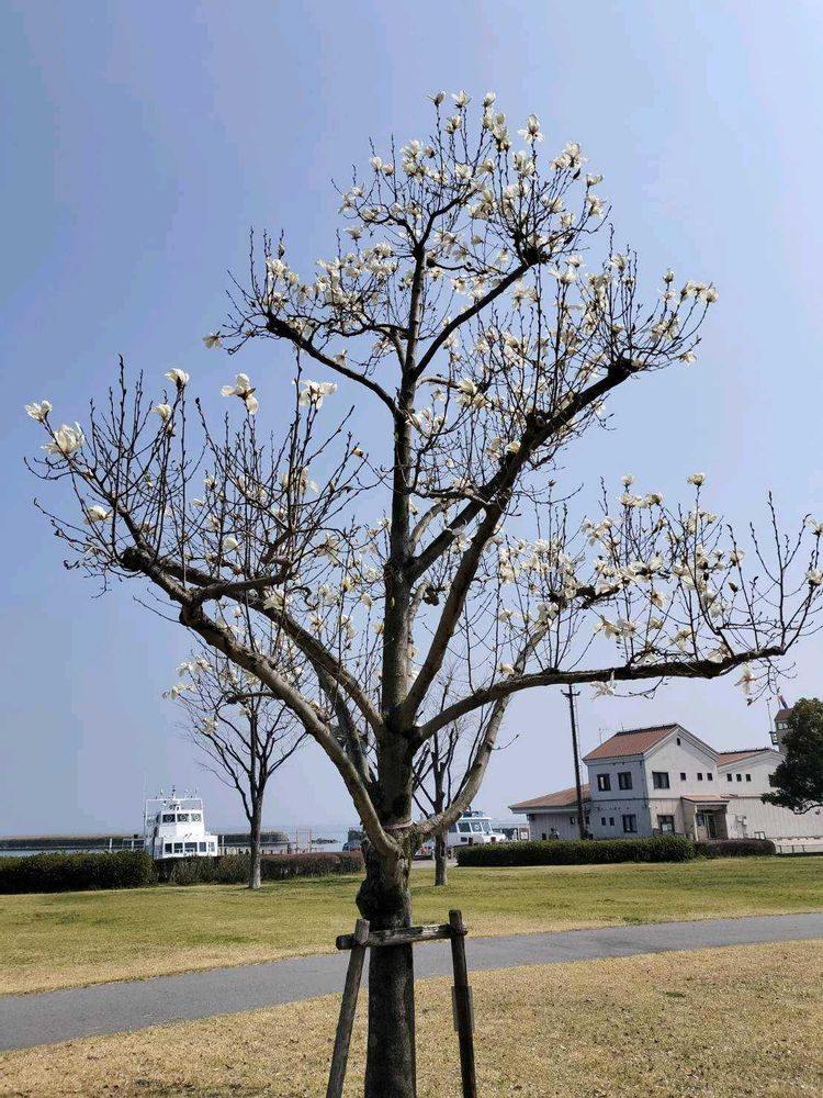 大津港の公園のこぶし。後ろは琵琶湖ホテル。