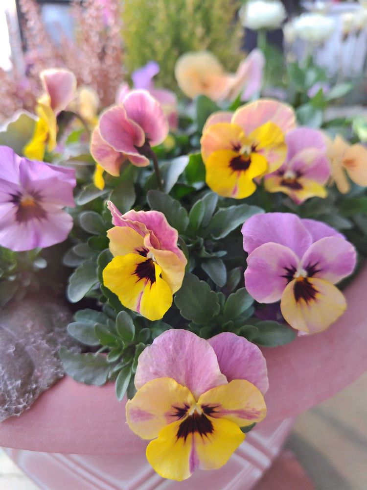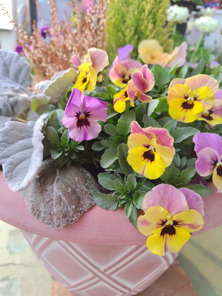 寒い冬を乗り越えた寄せ植えのビオラが咲き始めました💛🩷💜💛