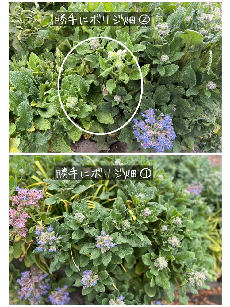 3️⃣ 勝手にボリジ畑①②こんなに茂っているのに白花は○の中だけ😂