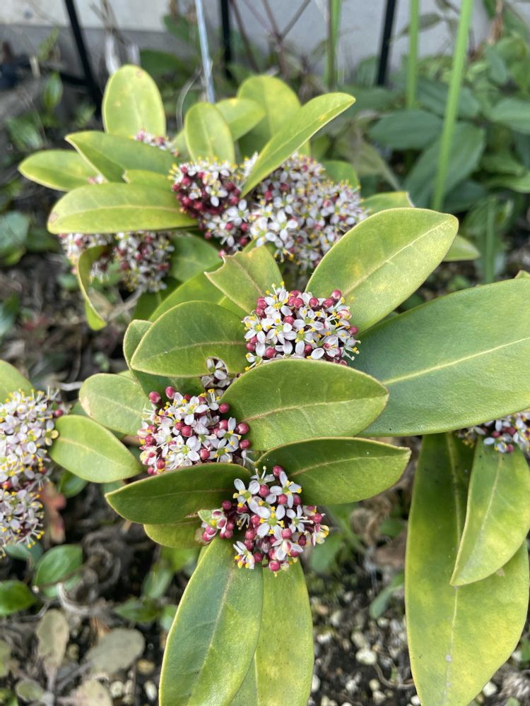 スキミア「レッドドワーフ」。去年(2025年春)苗を購入して地植え。
