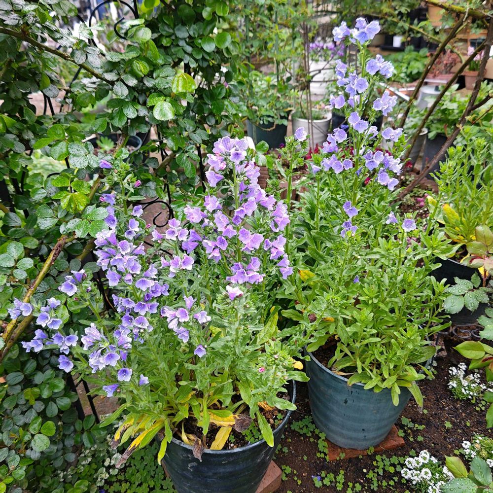 【1枚目】エキウム・ブルーヘッダーが一部開花中。なぜかここの2鉢だけこんなに咲いてきています。早く咲き過ぎてバラとのコラボは夢に終わりました😑