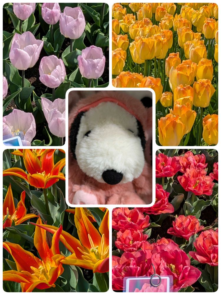 スヌーピー、かわいいチューリップに囲まれて嬉しそうですね💕