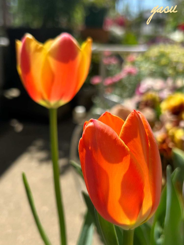 ①私には珍しいシュッとしたチューリップ🌷 オレンジとイエローのグラデーションがまた珍しいチョイス。うん綺麗😊