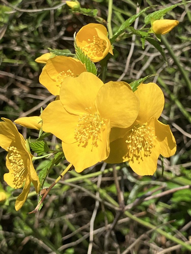 こんにちは、雨が上がり暖かな陽射しがさしています。庭の一重のヤマブキが咲き出しました。