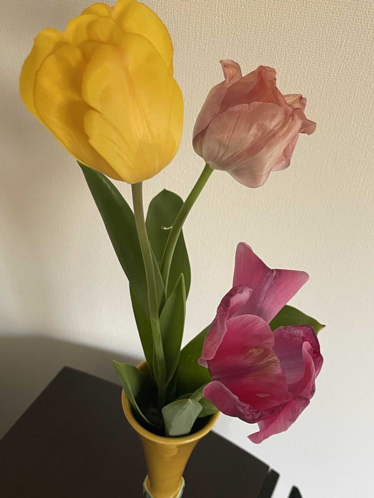 ②開き過ぎてしもた砺波チューリップ三色、花瓶に🌷
