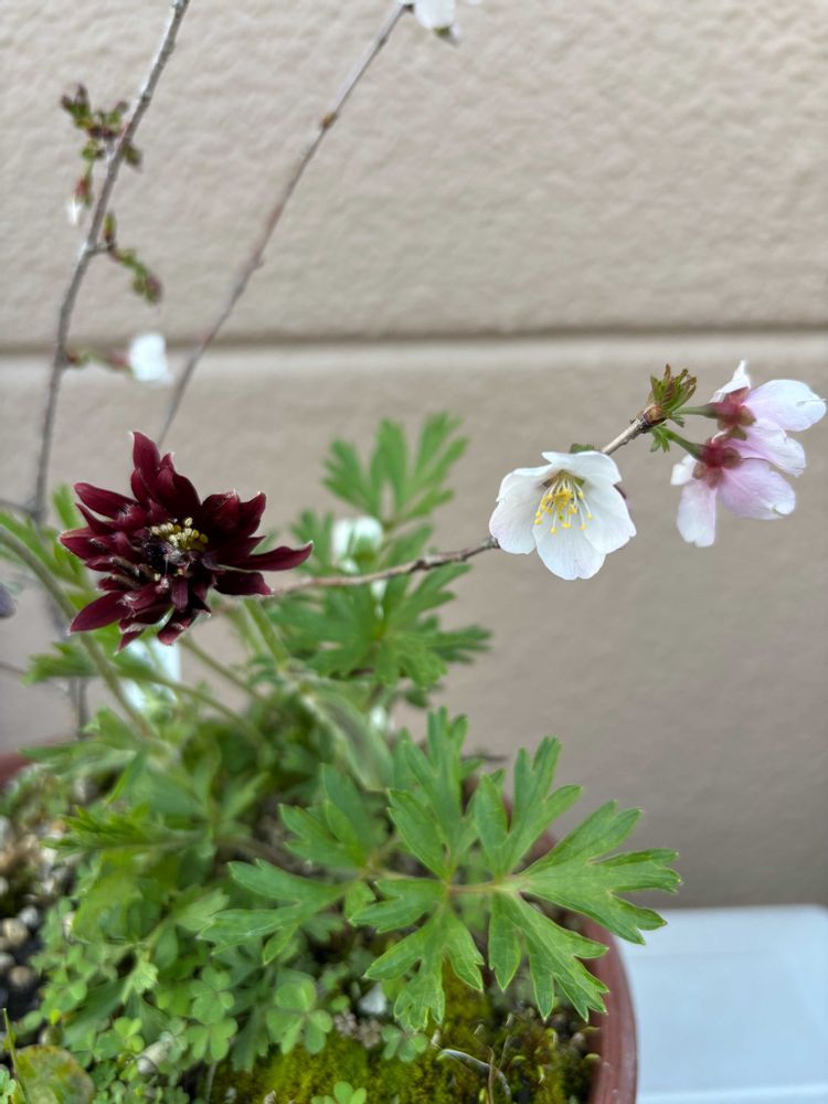 大好きなオキナグサと富士桜の盆栽仕立て、ともに咲いています🌸