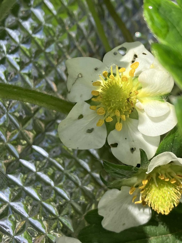 それと私の苺の花🌸😭やっと咲いたと言うのに何でしょう?穴ボコだらけ🐛誰の仕業かな?