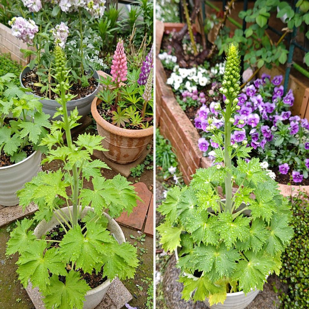 右下↘️の8号根はり鉢のエリンジウムもすでに窮屈そう? 底をのぞいたらもう根が出ていた! 花期は7月なのに!😱 早急に鉢増ししなくては!💪
